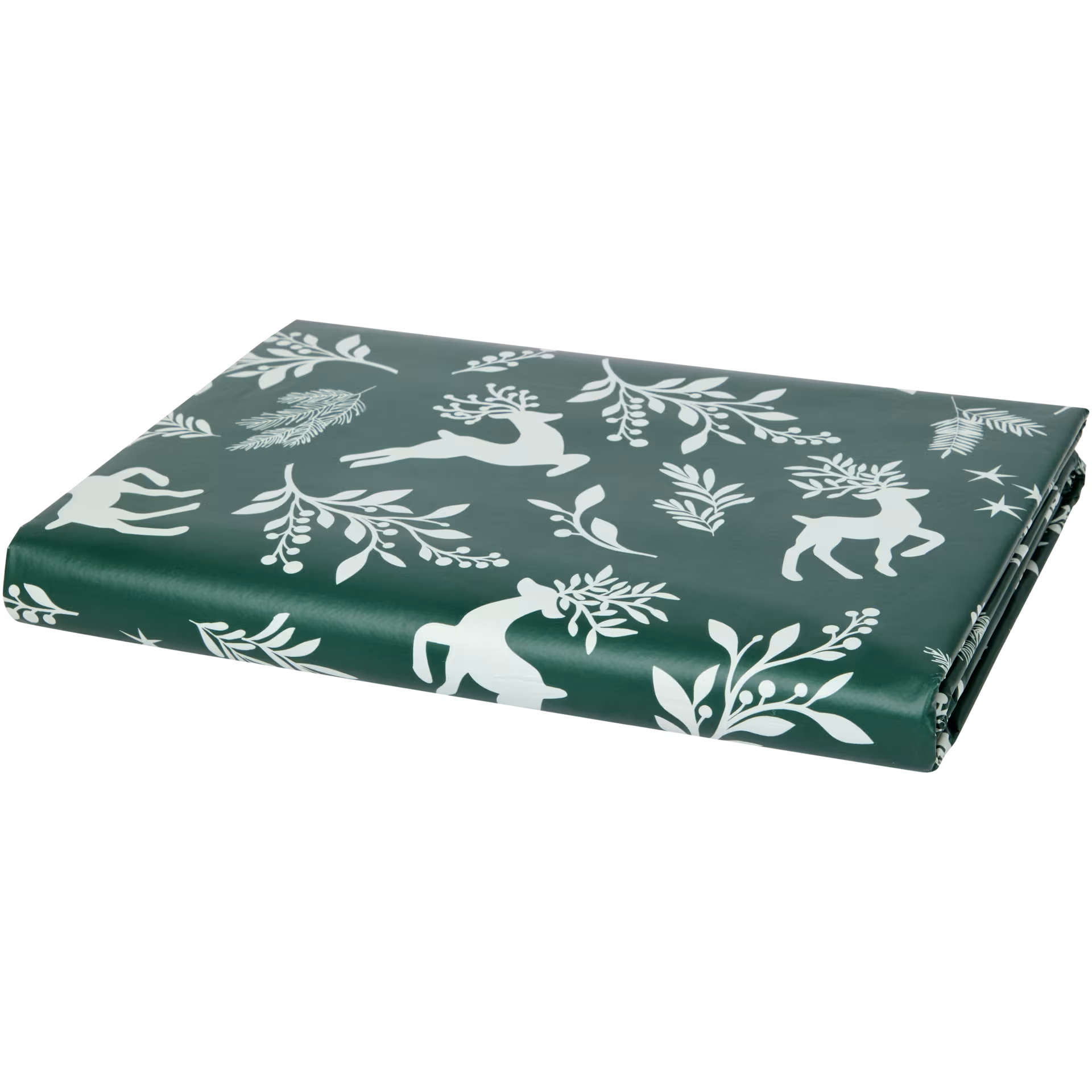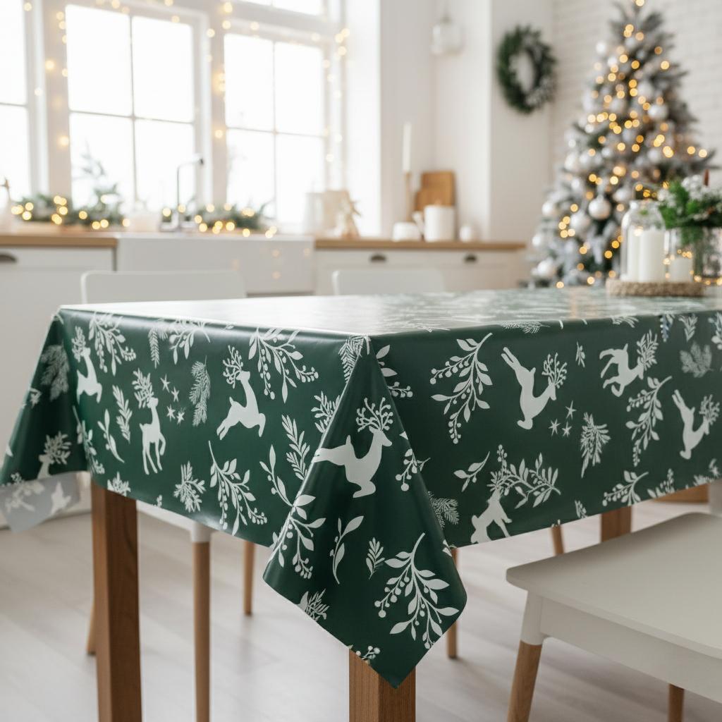 Questa elegante Tovaglia Natalizia in Plastica è il modo ideale per vestire la tua tavola con un tocco di magia sofisticata, proteggendola con la massima praticità durante le feste. Il design evoca un'atmosfera nordica e incantevole, caratterizzato da un motivo di renne stilizzate, rami di pino e bacche, tutti disegnati in un nitido bianco che risalta sul profondo verde bosco. Questa combinazione cromatica crea un look festivo, elegante e accogliente, perfetto per ogni celebrazione. Realizzata in un materiale pratico come la plastica, la sua superficie è straordinariamente facile da pulire e straordinariamente funzionale: qualsiasi fuoriuscita si può gestire rapidamente con un panno umido, permettendoti di goderti la compagnia senza preoccupazioni. Scegli questa tovaglia per unire senza sforzo la bellezza di un design natalizio raffinato alla comodità essenziale per le tue cene.